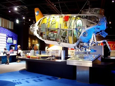 → 三菱重工が、横浜のみなとみらい地区に技術センターを作ったことから、この一部として設立したのが「三菱みなとみらい技術館」。三菱の造船、自動車、鉄道、海洋、航空宇宙などの事業全体を紹介する博物館である。技術館では、三菱重工が現在技術開発を進めている事業、環境エネルギー、深海開発、航空機、宇宙装置・ロケット、交通システムなどを実物、模型、シミュレーションなどで総合的体系的に展示している。三菱重⼯の足跡と現代の技術挑戦をみることができる。なかでも、開発中の国産ジェット旅客機MRJの機体模型、H2ロケットエンジン、有人潜水船「しんかい6500」実物分解展示などは圧巻である。