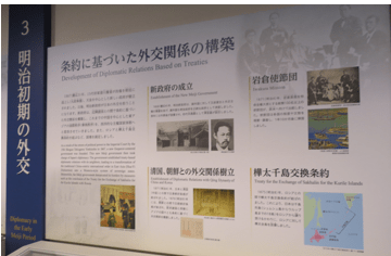 明治初期の対外関係を示す展示資料としては、次のようなものがある。日清修好条規(1871明治4年)、樺太千島交換条約批准書(1875明治8年)、(各国と結ばれた通商修好条約)改正までの道のりを示すパネル解説、日英通商航海条約調印書(1894明治27年)、日米通商航海条約批准書(1911明治44年)など。