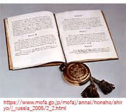 まず、この期の対外関係の進展を見ると。ロシアとの関係では旧幕府時代に締結された「日露通好条約(1855安政元年)」の確認と批准書の交換が行われている。これにより千島・樺太の領土問題が確定した。掲載資料は、1875年(明治8年)の「樺太千島交換条約」批准書である。これに先立っては日清修好条規(明治4年)、日朝修好条規(明治9年)が調印されている。 「日清修好条規」は、天津で明治4年に、日本と清の間で初めて結ばれた近代的な条約である。相互に開港することなどを定めていて、同時に、通商と海関税則も調印されている。「樺太千島交換条約批准書」はロシアとの樺太・千島の領有を両国政府が正式に宣言するものであった。