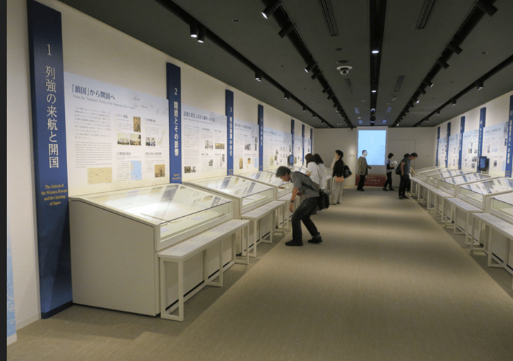 この期の主な外交文書として展示されているものをあげると、次のようなものが見られる。日米和親条約批准書(1855安政2年)、日米修好条約(1858安政5年)、日露通好条約(1855安政元年) など。 よく知られるように、1853年、米国のペリー提督が突然浦賀に来航して幕府に開港を促し交渉を迫った。これを幕府は一度拒否したが、米国は翌年7隻軍艦をつれて江戸湾深くまで侵入、強く開国を迫るという事態が発生。幕府はアヘン戦争の再来を恐れ交渉受託、1874年に横浜村で「日米和親条約」締結し、1855年(安政2年)正式に批准することで200年以上続いた「鎖国」は終わりをとげることとなる。史料館で展示されているのは、この記念すべき「和親条約」批准書の写し(副書)である。