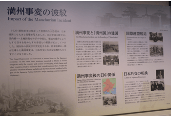 この時期の展示品は、パネル解説のほかは余り数が多くはない。この時期のものとしては、「日満議定書」(1932年、昭和7年)と「国際連盟対策に関する件」(1933年、昭和8年)の文書が知られる。前者の「日満議定書」は、中国北部と南満州鉄道権益を巡って日本陸軍が軍事行動を起し、北部地域を占領、一方的に満州国を樹立させた議定文書であり、後者の「国際連盟」文書は、日本の中国権益を認めない国際機関「連盟」を不満とし脱退を宣言したものである。これをきっかけに日本は欧米と対立、戦争への道を歩むことになる。この時期、展示解説でも、対外関係が軍部に牛耳られることも多く「外交不在」嘆いてもいる様子がうかがえる。
