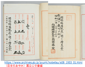 なお、関係する日本側の事態処理を示す政治文書としては、国立公文書館の文書の中に「日独防共協定」締結(1936年)、「盧溝橋事件」処理の閣議(事変呼称ニ関スル件ヲ定ム)(1936年)、「上海事変」処理(上海事件ニ関スル枢密院報告)(1932年)、「日独伊三国同盟」締結閣議(日本国、独逸国及伊太利国間三国条約締結ニ関スル内閣告諭)(1940年)、「対米英宣戦」布告(米国及英国ニ対スル宣戦ノ件・御署名原本)(1941年)などがある。