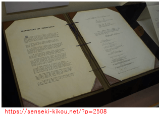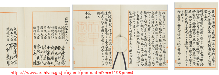 1941年、米英と戦争状態に入った日本は、4年にわたる激しい戦闘と本土・沖縄を焦土に化す被害、人命の喪失を経て1945年8月15日連合国への無条件降伏によって太平洋戦争は終わりをとげた。この間の連合国側と交わした外交文書と政府決定文書は、現代史上最も重要な公文書の一つである。外交史料館展示室には、このうち、日本の「降伏文書」(1945年9月2日)、連合国から日本政府に手渡された「指令第一号」(同日)が展示されている。また、公文書館では「ポツダム宣言受諾詔書」(1945年8月14日)を公開しているので参考になる。 (終戦の詔書 (archives.go.jp))(国立公文書館デジタルアーカイブ)