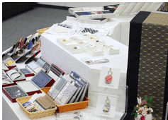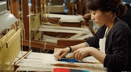 → 博多織は、たくさんの経糸(たていと)に、細い糸を数本まとめ合わせた太い緯糸(よこいと)を力強く打ち込んで作られる絹織物である。1976年に国の伝統的工芸品に指定されている。江戸時代、黒田長政が幕府への献上品として博多織を用い、その際の柄が後に「献上柄」として博多織の代表的な柄となった。これ以降、献上博多織は、献上された独鈷華皿文様の博多織として一躍ブランドになっている。この博多織を一堂に展示している。
