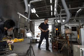 クリスタルガラスの深い輝きと精巧なカット技術による「ぼかし」の美しさが特徴の薩摩切子の製作工程を見学できる「薩摩切子工場」。そこでは、伝統を受け継ぐ職人たちの熟練した技が示されている。切子工場は、溶けたガラスから器の型を作る「吹き場」と、グラインダーを使って模様を彫り込んでいく「カット場」、そして最後の仕上げとなる「磨き」の3つのエリアで構成されている。