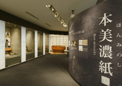 → 美濃和紙は1300年以上の歴史と伝統を誇る。繊細できめ細やかな風合いを持ち、美しく丈夫な和紙作品が特徴といわれる。丹念に漉かれる一枚一枚は優れた自然環境と卓越した職人の技をみせている。歴史をたどれば、美濃和紙が全国的に広がったのは、室町時代に美濃国守護の土岐氏が地元産業を活性化させ製糸業を保護したことが大きい。また、土岐氏と交流のある公家や僧侶が好んで美濃和紙を使用し全国に知られるようになった。江戸時代には、美濃が専売制度によって障子紙として確固たる地位を築き、高級和紙として地位づけられた。しかし、一方で西洋紙の普及で和紙全体の需要は減少したが、美濃和紙は日用品として今も広く使われている。そして、1985年には経済産業省により伝統的工芸品に指定され、現代でも手漉き和紙は美濃和紙の古くからの伝統が受け継がれている。博物館は、これを強く印象づける内容となっている。