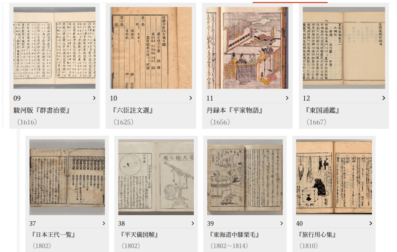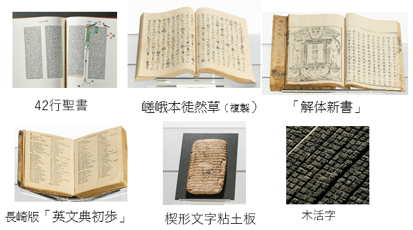 日本最古の印刷物「百万塔陀羅尼」(764-770)、伏見版『貞観政要』(1600)、「グーテンベルク 42行聖書 原葉」(1455)、「和蘭天説」(1796)、「駿河版銅活字」)1606-1616)、「築地活字木活字」(収蔵、1869)など。