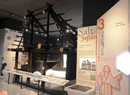 世界の塩展示コーナーでは、世界の塩資源として、海水の成分、世界の塩資源の分布などを紹介、珍しい岩塩彫刻も展示している。日本の塩コーナーでは、古代の塩焼き、各地の塩の揚浜、流下式塩田、現在の製塩をテーマに展示している。