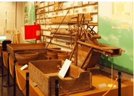 → 赤穂地方は古くから塩の産地として栄えてきた。なかでも江戸時代には入浜塩田による製塩法が完成され、その技術は瀬戸内地方を中心に広く伝わった。ここでは、赤穂流の入浜塩田の特色や技術、また赤穂塩の流通などについて、製塩用具(国指定重要有形民俗文化財)、入浜塩田模型、塩廻船模型などで説明している。特に、製塩用具は、今日では見られない塩づくりの技術や作業の過酷さを教えてくれる。