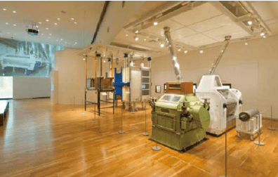 新館展示の中身をみると、企業歴史ギャラリー、正田貞一郎ギャラリー、創業期ロール機、アーカイブがあり、新館では、新旧ロール機展示、製粉工場パノラマシアター、製粉技術のいま、小麦研究所、大型プロジェクター映像が備えられている。