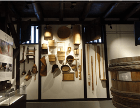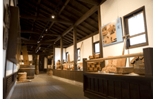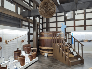 展示では、洗米作業をした洗い場や火入れに使った釜、上方から江戸へ酒を運んだ「樽廻船」や「菱垣廻船」の模型、「麹室」、天保10年と記された棟梁、発掘作業により発見された地下構造の「槽場(ふなば)」跡など、重要有形民俗文化財となっているものも多い。
