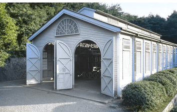 → もう一つの明治村にある鉄道施設は「鉄道局新橋工場」。東京・汐留の新橋停車場構内に東京鉄道局が建てた工場施設の一つである。この新橋工場には、旋盤、木工、鍛冶、鋳物など9工場が設けられており、この建物は木工場で鉄道寮新橋工場にならって造られたものであった。大正8年(1919)に大井工場に移築され第二旋盤職場として、昭和41年(1966)まで使用されたといわれる。内部には、明治天皇が乗車したといわれる御料車が展示されている。