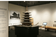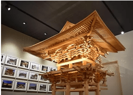 → 木組み博物館は、木組みを中心に左官、漆などの伝統技術や素材、道具などを紹介する体験型の博物館。会場は第一展示場と第二展示場に分かれており、前者では、大小の木組み見本、木組み屋根模型、木材見本、木組みの写真と解説パネル、後者では、寺社建築に実際に使用される工事技法の塗り壁、屋根材と瓦、漆、彫刻、各種大工道具が展示されており、全体として大工などの職人が建築をどのような作業行程で行っているかを見ることができる。このうち、目を引くのは奈良・薬師寺三重塔の「初重斗組」といわれる木組みの実物模型。これは、国宝薬師寺を再建した際、昭和の名棟梁といわれた西岡常一が製作した作品の一部の再現した作品となっている。そのほか、木組み30点余りの木組み見本は、実際に手にとって触れることができ、組み立て構造が実感できる優れた展示となっている。第二展示場では、寺社建築の装飾となる“彩色彫刻作品” 錺金物“、茶室の空間設計や能舞台の音響効果の構造模型などが興味深い展示が多数。