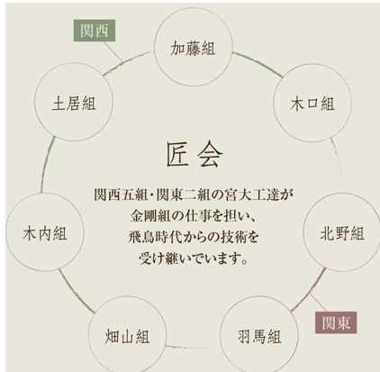 なお、金剛組には専属の宮大工によって結成する「匠会」という職人集団を形成している。ここでは、金剛組が、1400年余りの間、弟子から弟子へと伝えてきた技を、さらに次の世代に伝えること、たがいに教えあい、学びあって、ともに若い大工を育成、宮大工としての一体感を高めていくとしている。(図参照)