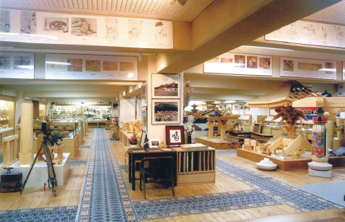 → 釘などを使わずに材木を組み立てたり、指し合わせたりして作る「指物」の工芸館。机、タンス等の指物など、木の根などの乾燥した木材を伝統技術を駆使して作ったさまざまな作品を展示している。「木の暖かみ、手づくりの良さを多くの人に知ってほしい」との説明。