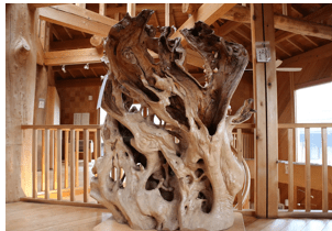 → 木力館は、材木業を営む経営者が、桧、杉、もみなど国産の天然木で作った木造建築の博物館。木の総合情報発信館として建物自体が展示施設となっている。木が生み出す、香りと温もりに触れて、木のすばらしさを体感で感じて欲しいと開設したという。螺旋階段のカーブは「曲げた」ものではなく、太い木材からパーツをひとつひとつ熟練の大工の手刻み(のみ・カンナ等の加工)で削り出して作り上げられている。建物全体は伝統の「通し貫(とおしぬき)工法」を用いており、構造躯体(骨組み)には金物等は使っていない。構造躯体(骨組み)はもちろん、壁や床、窓枠等も全て木でできており、断熱材や新建材といった化学製品は使用していない。博物館を建築した館長大槻忠男の「木の良さを知って頂きたい」との思いが伝わってくる展示施設である。