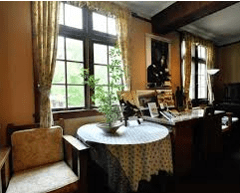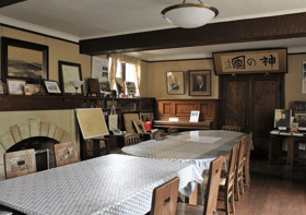 → 英語教師として来日し建築家となったW. M. ヴォーリズ(日本名一柳米来留1880-1964)の功績を記すため、氏の居宅をそのまま記念資料館としたもの。近江八幡市の名誉市民第一号となったのを機会に、83年間にわたる生涯の記録と遺品を展示している。ヴォーリズは、来日後帰化し、伝導活動をとおして学校や病院を建てるなど近江八幡市の教育や医療に大きく貢献している。“メンソレータム”(現在はメンターム)で有名な「近江兄弟社」を創立・経営」するかたわら建築技師としてもおおいに腕を振るい、近江八幡に多くの洋館建築を建てている。