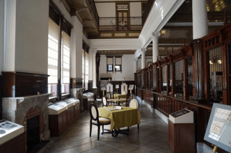 → 日本の建築史に大きな足跡を残した明治の建築家辰野金吾の生涯と功績を記念するため開設された記念博物館。辰野が佐賀県唐津出身で旧唐津銀行とのゆかりがあったことから、同銀行の中に設けられている。この1912年に建てられた旧唐津銀行ビルも辰野が設計に関わったもので、建物のデザインは、英国風クイーン・アン様式を日本化したもので(「辰野式」)、赤煉瓦に白い御影石を混ぜ、屋根の上に小塔やドームを載せて、王冠のごとく強調する辰野流の工夫が加味されている見事なもので重要文化財に指定されている。