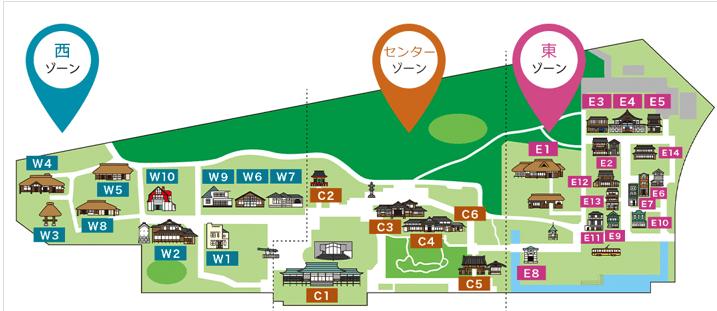 東ゾーンは下町の町屋、商家が並ぶコーナーで、小寺醤油店、鍵屋(居酒屋)、銭湯の子宝湯、仕立屋、武居三省堂(文具店)、丸二商店(荒物屋)、大和屋本店(乾物屋)、万徳旅館などと、対象・昭和時代のといった街並みの再現がある。