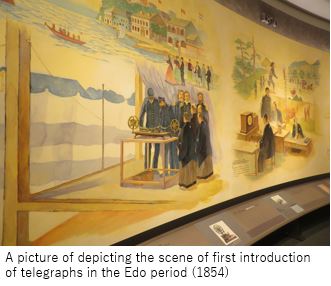まずは、初期の逸話と機器の登場展示では、壁面に描かれた日本社会への電信機器の受容を描いた大きなイラストが目につく。第一に描かれているのは、1854年、ペリーが幕府に「通信機」を持ち込んで紹介しているシーン。日本人が初めて実際の電気通信装置を見た驚きを再現したものだといわれる。また、通信の重要性を実感した明治政府が、明治2年(1868)に早くも電信の導入を図るため東京・横浜間に仮設工事を行った様子、1980年には電信サービスを始めた年譜などもみられる。展示品では、ペリーの持ち込んだモールス電信機の写真、日本で最初に使われたに「ブレゲー指字式電信機」などがある。