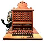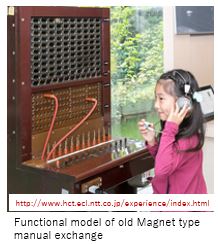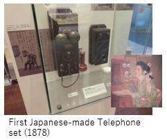 一方、電話普及の展示では、明治23年(1890)に東京横浜間で初めての電話サービスが開始されたことが記されている。当時、電話交換局の交換手によって一つ一つ手動で交換通話する煩雑なもので非常に高価な通話料であったという。史料館では、ベルの電話機を模倣して製作された「国産一号電話機」、{磁石式手動交換機」の実物が展示されている。また、当時の電話の普及を描いた壁面もあり興味深い展示である。