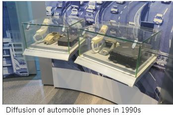 こういった中、1993年に第二世代デジタルコードレス電話として開発されたPHSが、1995年、簡易型携帯電話サービスとして開始され、端末や通話料の安さもあり若年層を中心に電話の新しいスタイルとして普及する。PHSは、ショートメール(SMS)、セルラー文字サービス(DDIセルラー)、Pメール(旧DDIポケット)も可能であった。1997年には携帯電話ドコモ・ムーバ“mova”でもSMSも始まっている。この経過は、展示されている歴史館に携帯電話の実物と共に紹介されている。