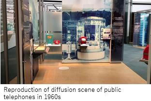 軍事用通信から民生部門の電気通信の進展が大きく歩み出したのは、第二次世界大戦後の1950年代からである。電気通信を主導したのはNTTの前身「電電公社」であった。公社が取り組んだのは「電話」網の拡大とサービスの向上。この過程で開発されたのが国産の「四号電話機」である。これまでのカワーベルから三号電話機でも、すべて外国製品の模倣であったが、初めて高品質品の自主開発となった。また、電報サービスと中継交換の整備、海底ケーブルの拡大、国際通信の復興とテレックス通信の開始、マイクロ波によるテレビ放送開始、装置面では自動交換機「クロスバー交換機」の登場、同軸ケーブルの開発などが大きく進んだ。 史料館では、時代疑似空間を使いながらこの間の社会変化と機器の進歩の様子を描写していて興味深い。例えば、当時の公衆電話機(赤電話)、各種の電話機、初期のクロスバー交換機、同軸ケーブル、職場に普及したテレックス、構内交換機(PBX)などが時代を追って進歩している姿が展示されている。