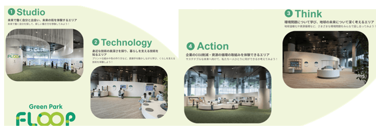 → 「Green Park FLOOP」は、富士フイルムが提供するショールームを兼ねた体験型博物館。設立の趣旨としては、訪問者に環境問題などについて学びや自由な発想を促進し、富士の関連技術を体験しながらサステナブルな未来の探究を促す場の提供を掲げている。館内の展示は、「Studio」「Technology」「Think」「Action」となっており、「Studio」はサステナブルな地球の未来を探究するための空間と未来の街を体験するコーナー、「Technology」は、プリント技術の原理や複合機の内部構造、色の作り方などを学んで富士の商品原理・技術の体験すること、「Think」は地球環境の課題・未来を考えること、そして「Action」は環境課題への取り組みを伝え、行動を促すコーナーとなっている。また、顧客向けのショールーム「Solution Zone」があり、環境負荷低減につながるオフィスソリューションを提供するコーナーも準備している。