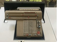 一方、日本では長い間「そろばん」が最もポプラーな計算器具として使われていたが、1950年代以降になると機械式の計算機も広く使われるようになる。このうち最も広く使われたのが「タイガー式計算機」。資料館の機械式計算機のコーナーには、このタイガー式計算機の歴代モデルが展示してある。そのほか、東芝の20-TC卓上計算機も見える。 また外国モデルの機械式計算機も数多く展示されていて、国ごとの特色がよくわかる構成になっている。このころ電動式の機械計算機も出現しているが、このうち「モンロー式計算機」が有名であった。その頃の値段で数十万円もしたというから非常に高価なものであったとされる。また、日本では、1950年代、カシオがリレースイッチを使った電気式計算機を開発しており、この貴重な初期モデル「 Casio 14-A」も展示してあった。これが日本における電気子式計算機開発の先駆となっている。一方、世界では1940年ごろから、リレー式計算機や真空管方式/トランジスタ方式の電子計算機、つまりコンピュータが開発され始める。