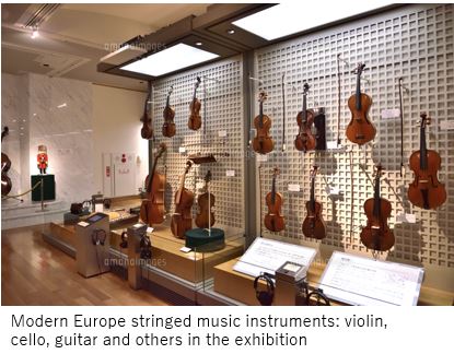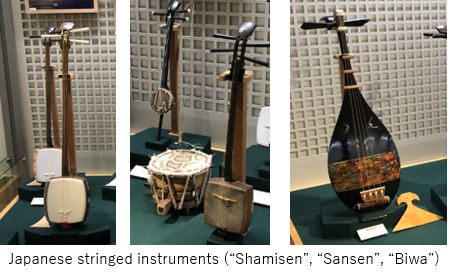ヨーロッパで生まれたヴァイオリンは弦楽器の代表格。しかし、弓で弦を擦って音を出す楽器の起源は古く且つ広汎で、ハープなどは紀元前3,000年前のエジプトなどでも見られたという。また、弦を指や道具ではじく撥弦楽器も同様に古い。アラビアのラバーブや、中世にオリエントから伝わったレベックという楽器、東洋では中国の二胡や馬頭琴などの擦弦楽器、インドのシタールも同様であるといわれている。これらが、大陸のシルクロードを通じて古く日本にも伝搬し、琵琶や琴、三味線となって現代に伝わったが通説。楽器を通じた広域の文化交流を感じさせられる。展示では、ヨーロッパ・ゾーンで、現代的な楽器ヴァイオリン、チェロ、ギターなど、アジアのシタール、馬頭琴、二胡、南米ではバンジョー、ビンンバウ、日本の伝統的な琴・箏、三味線、琵琶などが関連性をもって陳列されている。また、日本で生まれた大正琴も珍しい展示であった。