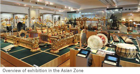 アフリカでは、ンゴマ、パンロゴ、クリンなど多様な民族打楽器が見られる。一方、ヨーロッパ・ゾーンでは、民俗打楽器のほか、オーケストラで使われる近代的な楽器となったティンパニー、ドラムセットなども登場してくる。 しかしなんといっても、展示の中で圧巻なのは、アジアゾーンの中心に大きく配置したある壮麗なジャワのガムラン、バリの竹ガムランの存在であろう。これらは見るものを圧倒させる魅力がある。