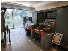 → 大阪大学総合学術博物館内にあるコンピュータの黎明期の常設展示。大阪大学では第2次世界大戦の後、真空管式の電子計算機の開発に取り組んでいた。数学を専門としていた大阪大学工学部の城憲三(1904-1982)は計算機の重要性を早くから認識し、その研究を行っていたが、大戦中にアメリカで開発された電子計算機ENIACの情報が公開されると、すぐさま電子計算機の研究に着手。このコーナーでは、さまざまな機械式計算機とともに、1950年に城が試作したENIAC型10進演算装置、1950年代に本格的に開発に取り組んだ大阪大学真空管計算機を展示している。