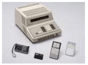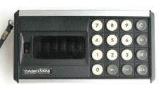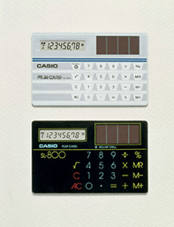 この先鞭を付けたのはカシオの「カシオミニ」であった。カシオやシャープなどの電気メーカーは計算器具を急速に小型化して価格を引き下げ、「電卓」を「そろばん」に変えて数計算の主役に引き上げていった。このことは展示でもよく示されている。この間、多様な「電卓」が開発されたが、初期の比較的重量のあるものからカードサイズの「電卓」まで、時代の流れにそって、どのように電卓が進化してきたかがよくわかる。