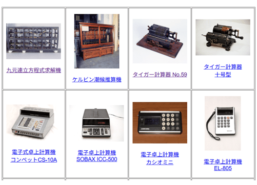 → 国立科学博物館理工電子資料館には、歴史的な計算機・計算用具、コンピューターが収蔵されており、インターネット上で詳細展示を見ることができる。